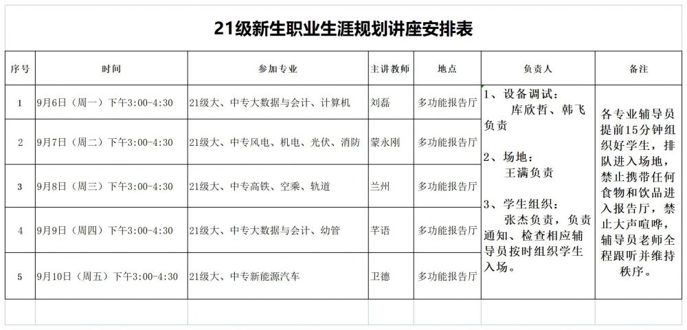 21級新生職業(yè)生涯規(guī)劃講座安排表