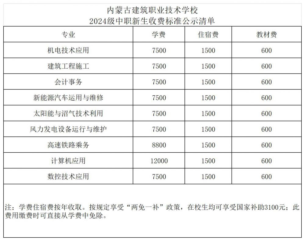 內(nèi)蒙古建筑職業(yè)技術(shù)學(xué)校2024級中職新生收費(fèi)標(biāo)準(zhǔn)公示清單