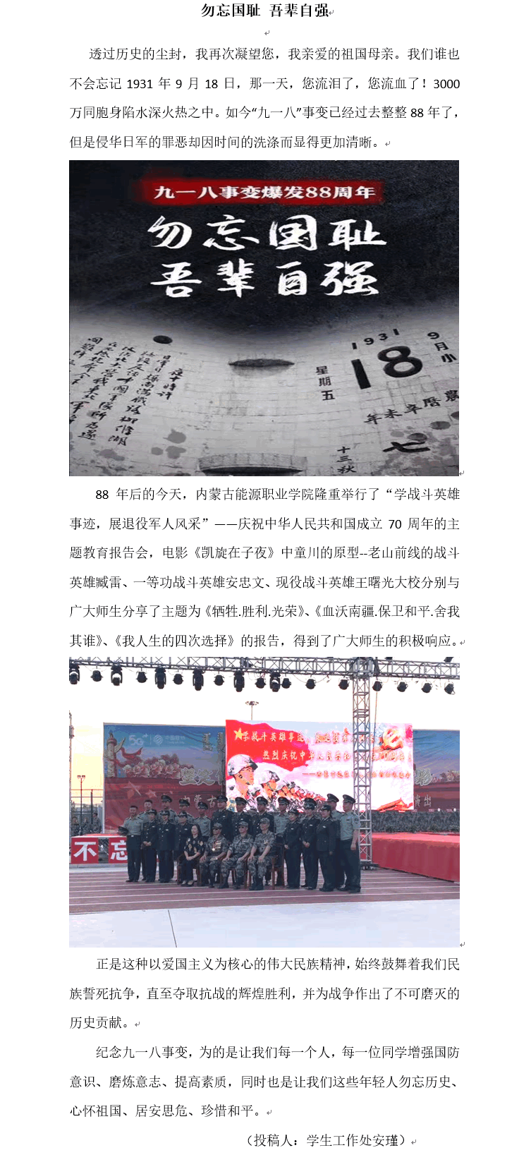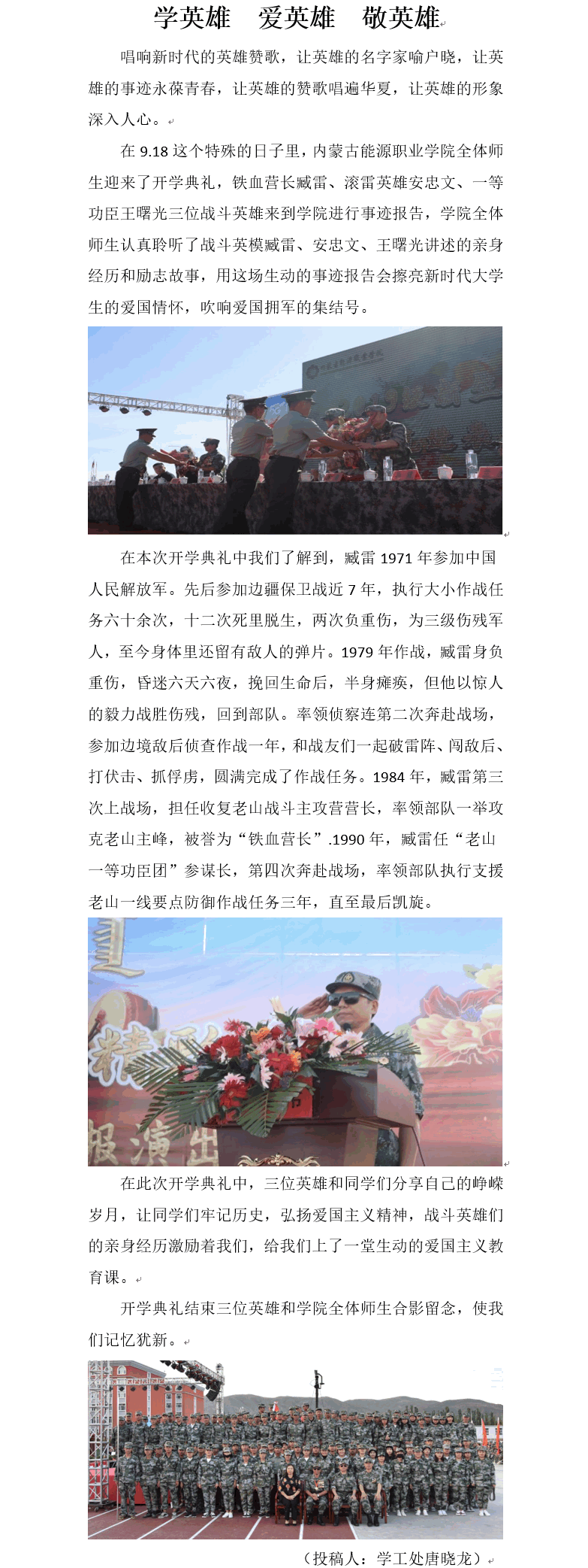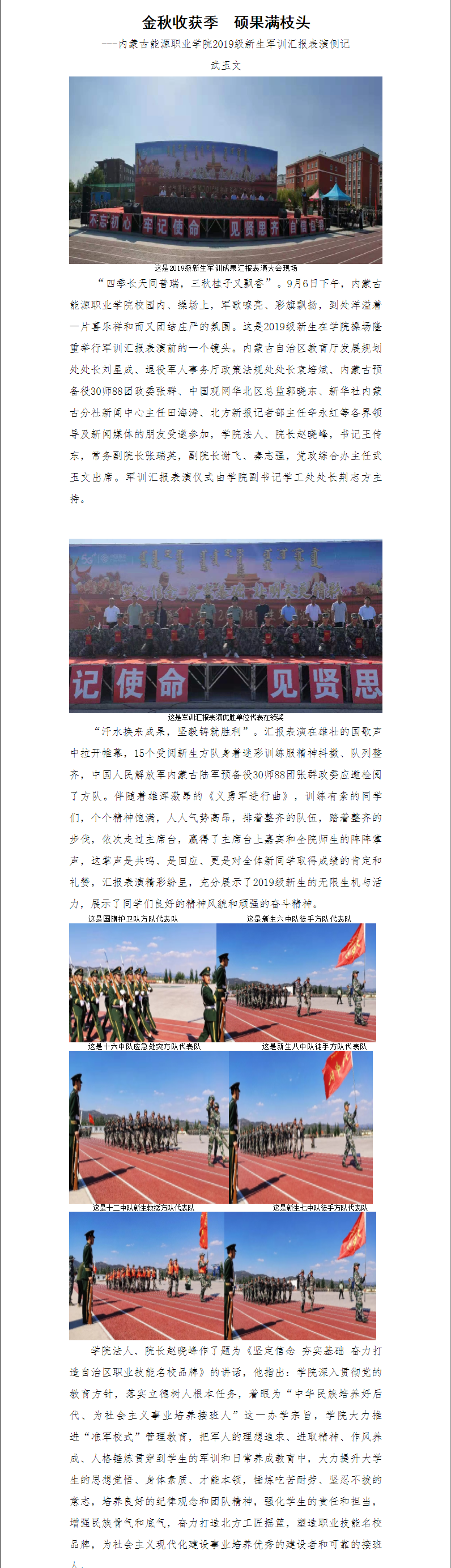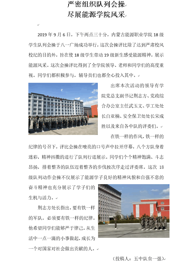 金秋時節(jié),丹桂飄香。攜著第一縷朝陽,內(nèi)蒙古能源職業(yè)學院全院師生迎來了第一次升旗儀式。據(jù)悉,每周一的清晨,學院各單位隊列整齊秩序井然走向國旗臺升旗位置。升國旗活動是學院對學生進行愛國思想政治教育的一項重要活動。長期以來,我院堅持弘揚和踐行社會主義核心價值觀教育,始終把國旗班作為載體不斷推進愛國主義教育實踐。從成立至今,學院國旗班以青春和熱血捍衛(wèi)著國旗尊嚴,以責任和堅守成為了能源學院一道亮麗的風景線...