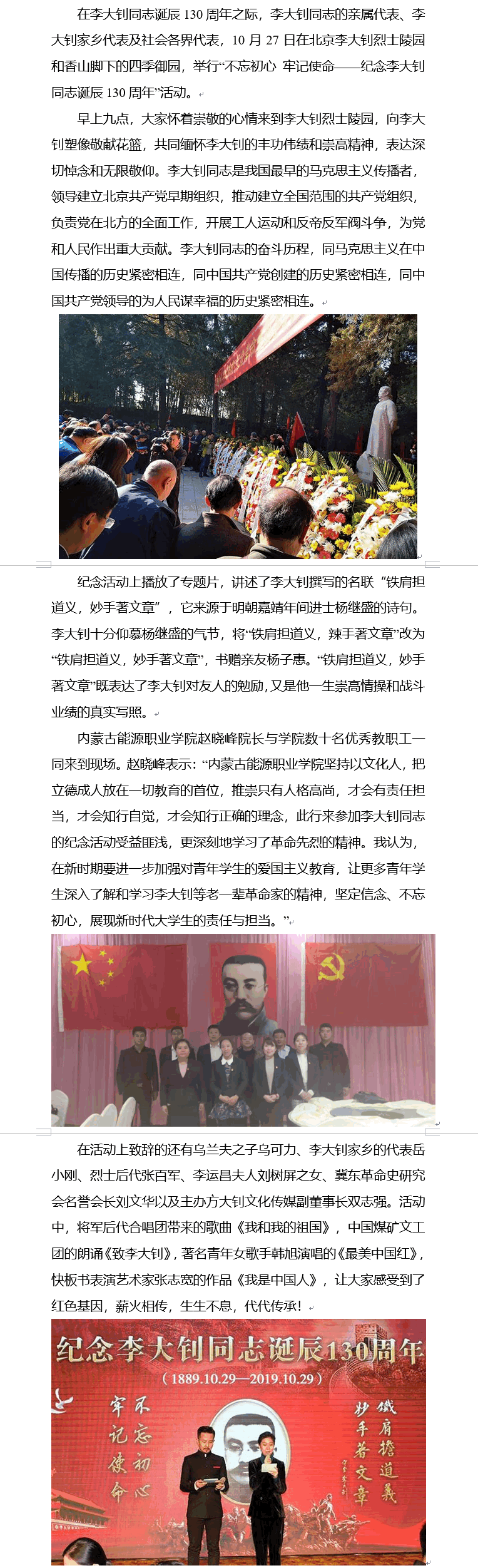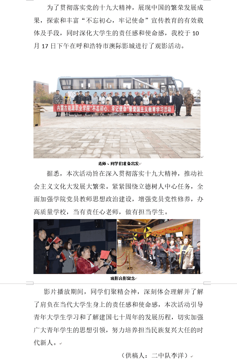 開展“不忘初心、牢記使命”主題教育,是新時代堅持和加強(qiáng)黨的全面領(lǐng)導(dǎo)、全面從嚴(yán)治黨、推進(jìn)新的偉大工程的內(nèi)在要求。根據(jù)上級黨委部署及團(tuán)市委要求,現(xiàn)制定我院“不忘初心,牢記使命”主題教育活動方案。學(xué)院將于2019年10月17日下午組織觀看獻(xiàn)禮70周年愛國主義教育影片《我和我的祖國》。一、活動目的:緊緊圍繞立德樹人中心任務(wù),全面加強(qiáng)學(xué)院黨員教師思想政治建設(shè),增強(qiáng)黨員黨性修養(yǎng),辦高質(zhì)量學(xué)校,當(dāng)有責(zé)任心老師...
